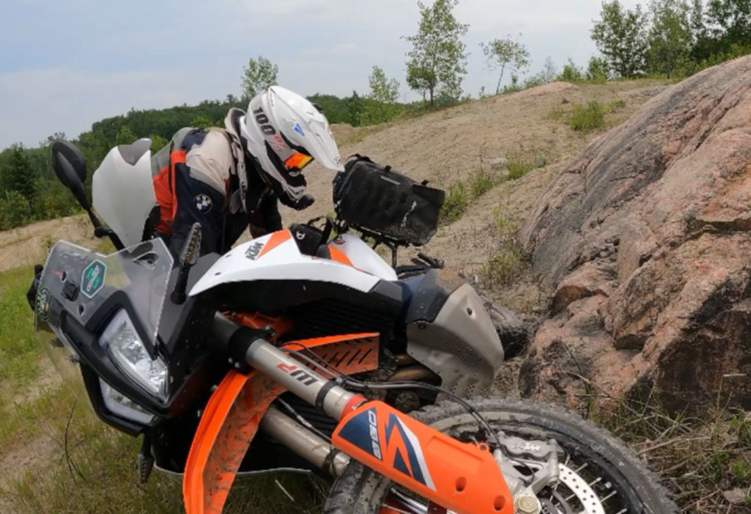 En mode aventure, dans un sentier, c’est différent. La chute doit plutôt servir à apprendre et à comprendre. Pourquoi je suis tombé? Comment faire pour l’éviter la prochaine fois? Lorsqu’il est assuré que le ou la pilote est intacte et que la moto est de retour sur ses roues, il est temps d’étudier la situation et de décider quoi faire.