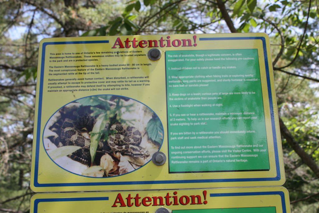 Au début de notre visite, nous avons appris qu’il y avait des serpents à sonnettes au parc, en fait dans cette région de l’Ontario. C’est strictement interdit de déranger le serpent à sonnettes Massasauga. O.K.! pas de misère avec ça, pour autant qu’il fait pareil!