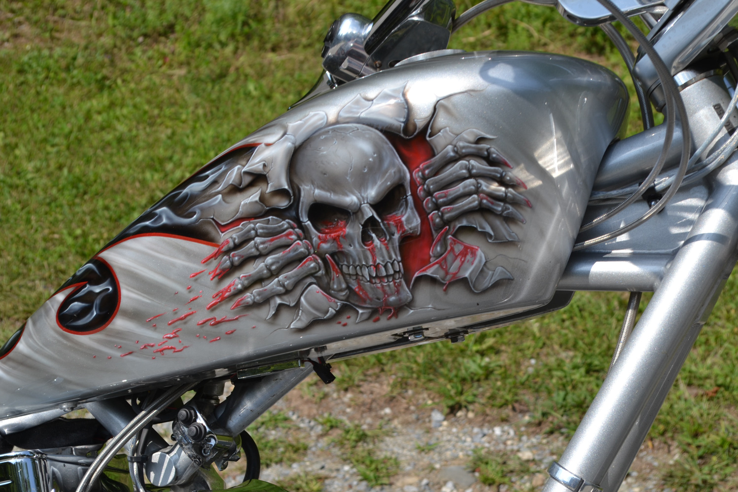 Elle était peinturée assez sobre avec un jeu de pointes vers l’arrière sur un fond gris métallique. J’aimais beaucoup la base grise, mais il manquait la « touch » Dessins-aux-Airbrush. J’ai donc fait une recherche sur internet pour trouver quelques dessins qui me plaisait bien, et j’ai appelé Dan, de Dotel Airbrush, pour lui exposer mon idée, qu’on a fignolée à deux en placotant… Et voilà le résultat! Très satisfait, et elle fait tourner des têtes, croyez-moi!